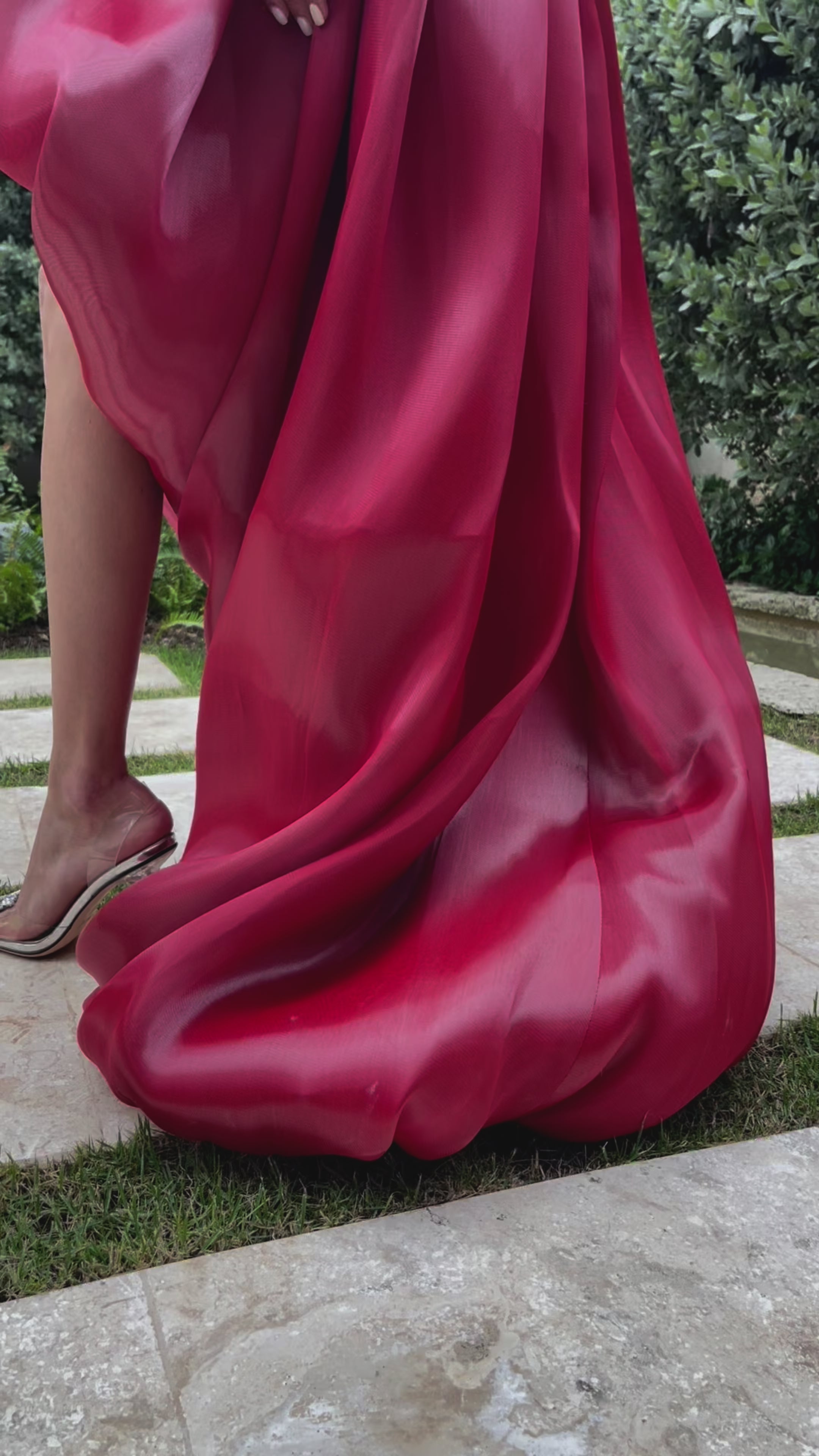 Introducing our "Melted Lollipop" gown, a true masterpiece of couture craftsmanship. Crafted from the finest couture organza, this gown boasts a liquid shine that catches the light with every movement, ensuring all eyes are irresistibly drawn to you.