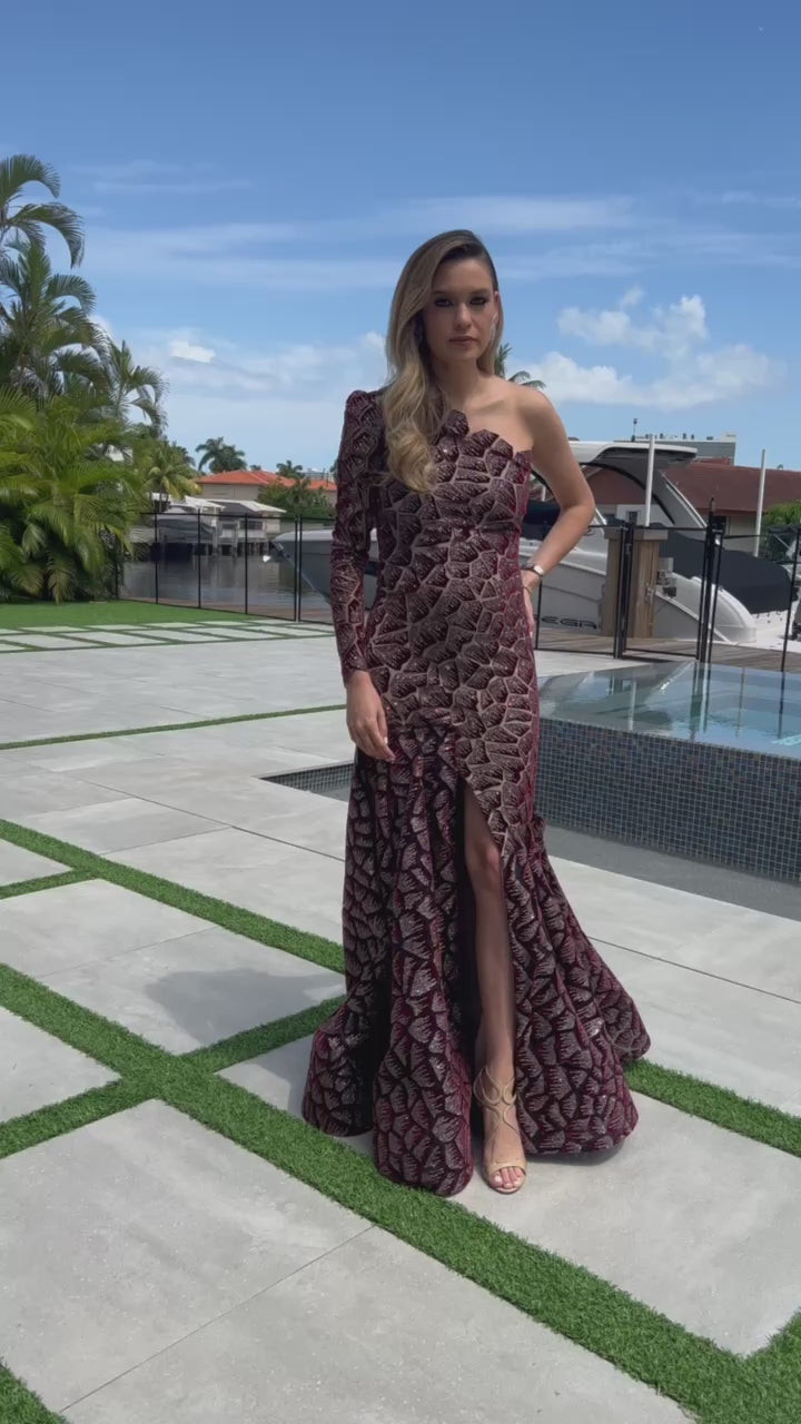 Make a dazzling entrance in our Burgandy One-Shoulder Glittery Velvet Gown, a showstopping design that exudes elegance and allure. Crafted from glittery velvet with asymmetrical patterns, this gown features a beige lining that enhances its intricate details. The high-low overskirt with a front slit adds drama and movement, while the sheer sleeve brings a touch of ethereal charm. Designed in a figure-hugging bodycon silhouette, this gown is perfect for red carpets, gala events, and unforgettable nights. Made to measure—please select your size and include your measurements at checkout. This gown is made to measure and cannot be returned.